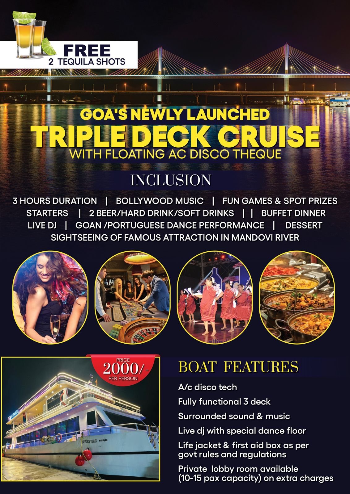 VIHAN CRUISE FLOATING IN MANDOVI RIVER DURATION 2 AND HALF HOURS ,VIHAN CRUISE COVER A PANJIM CITY SIGHTSEEN LIKE A ATAL SETU BRIDGE MIRAMAR BEACH, RIVER VIEW. LOCAL GOAN DANCE PRESENTATION COUPLE DANCE FAMILY DANCE DJ MUSIC.